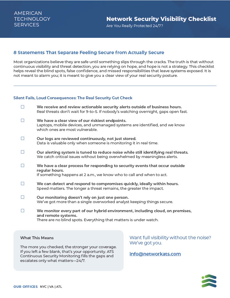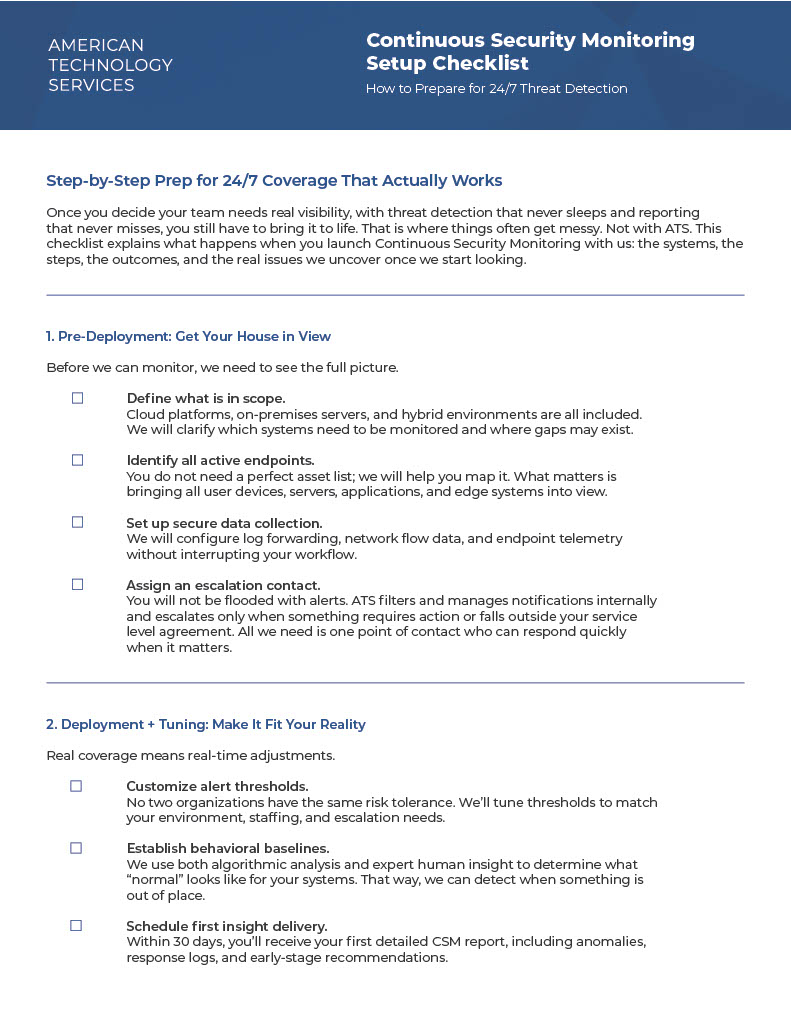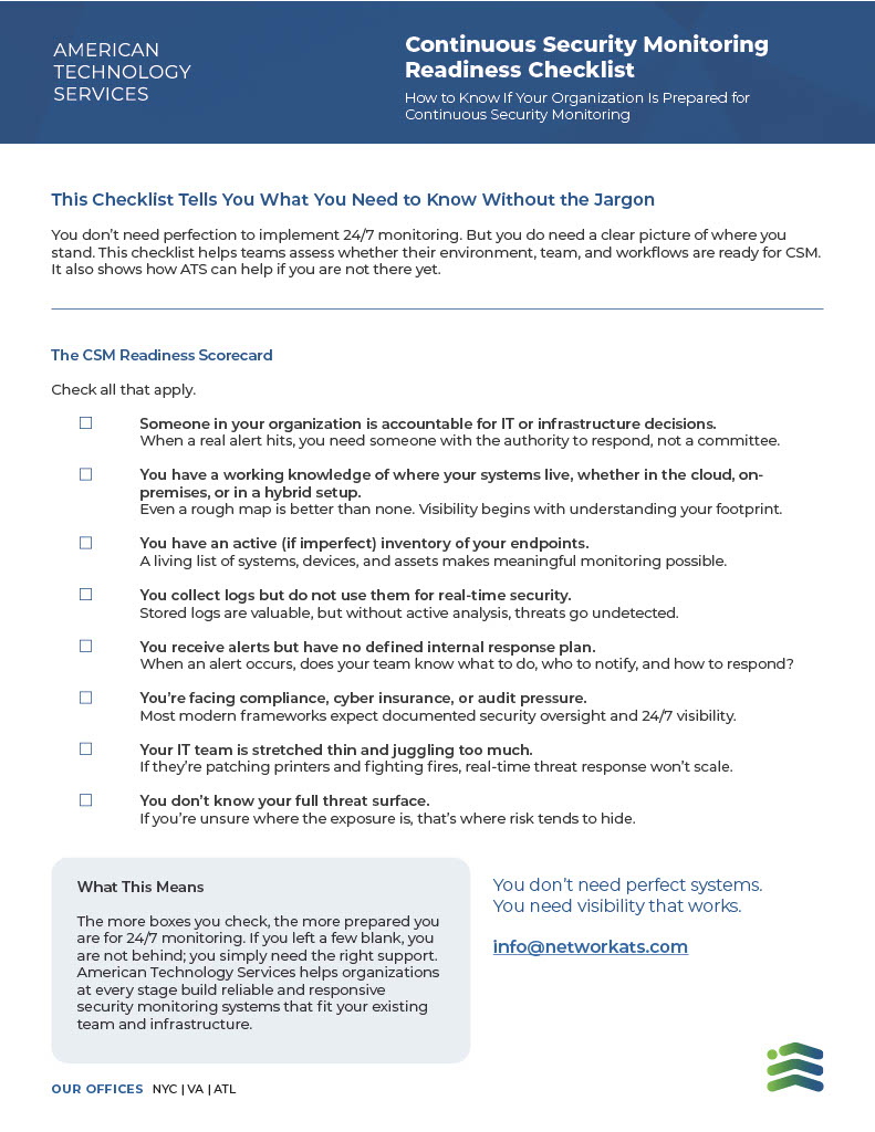 Think you’re ready for 24/7 cybersecurity monitoring? Use this checklist to assess your readiness, uncover blind spots, and see how ATS can help.